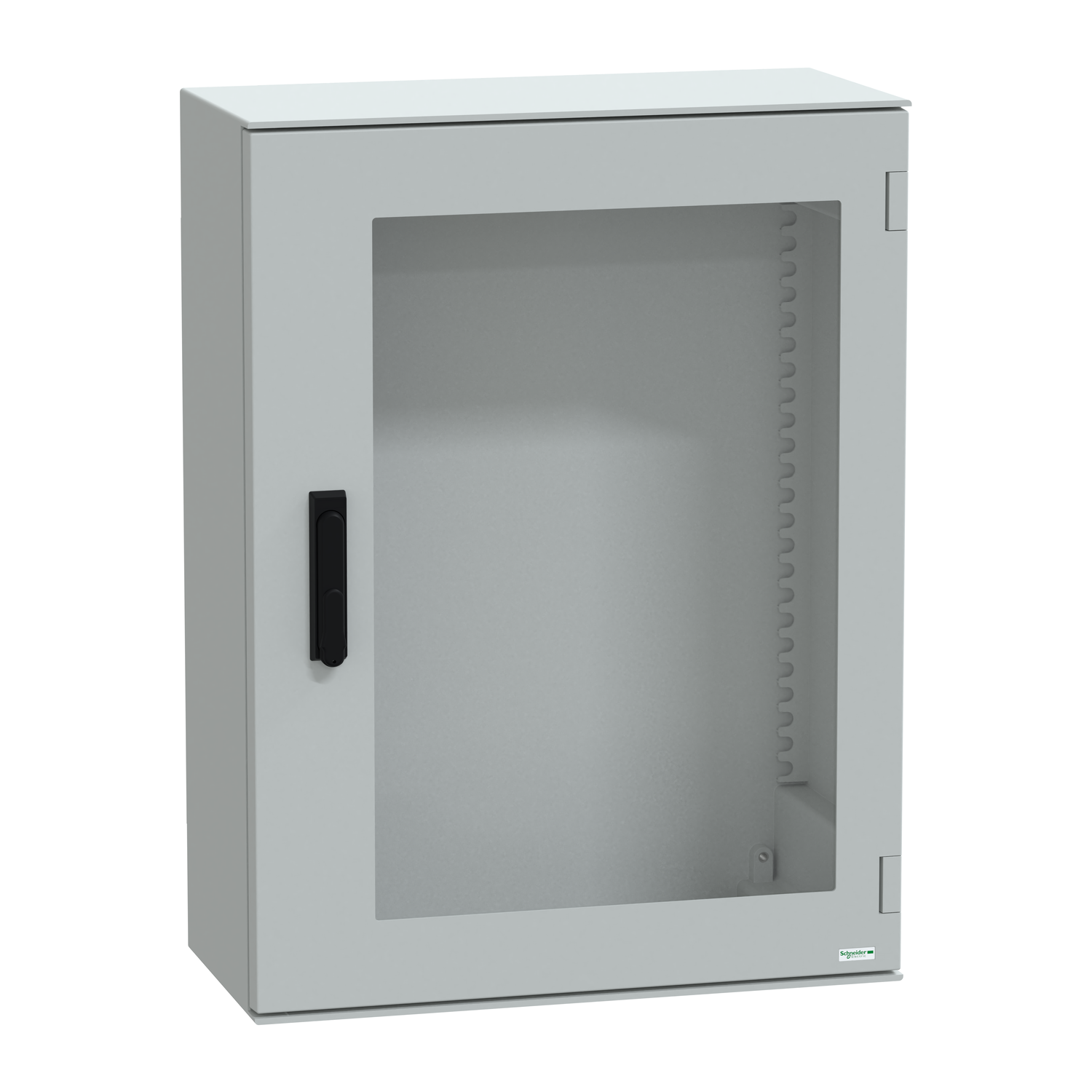 Wall cupboard in monobloc construction made of hot-pressed glass-fibre reinforced polyester with smooth surface. The material is self-extinguishing due to fire-retardant additives and fire protection agents in the polyester and thus withstands the toughest climatic, industrial and chemical requirements.